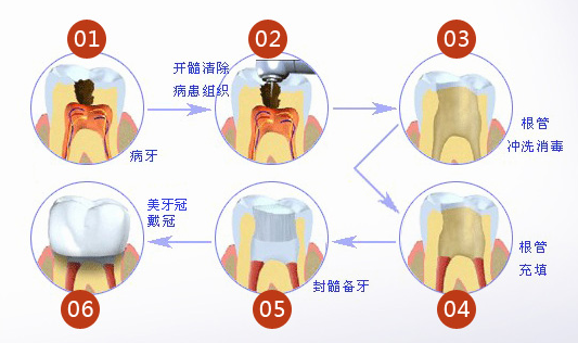 根管预备、根管消毒和根管充填。根据牙齿炎症严重程度、治疗的难度等因素的影响,一般需要分2-4次进行,目的是达到透彻消毒灭菌,确保疗效,每次间隔1周左右。
